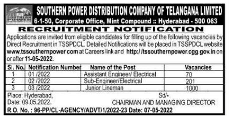 TS Southern Power Recruitment 2022: The Southern Power Distribution Company of Telangana Limited (TSSPDCL) has issued latest notification for 1271+ Assistant Engineer/ Electrical, Sub-Engineer/ Electrical & Junior Lineman Vacancies. Required education, salary information, application fee and age limit requirement are as following. Eligible candidates, who have completed Graduation, Diploma and ITI, must submit applications on or before 30th May 2022. See the notification below to see vacancies/positions available, eligibility criteria and other requirements.